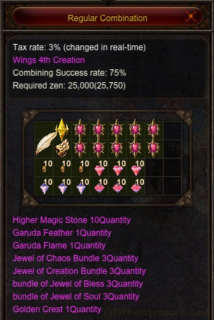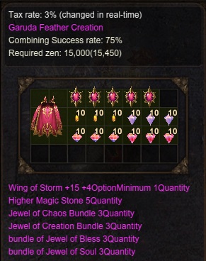 1x Garuda Feather 1x Garuda Flame (Drops from Medusa) 1x Golden Crest (Drops from Selupan ) 10x Higher Magic Stone 3x Bundle Jewel of Soul (10) 3x Bundle Jewel of Chaos (10) 3x Bundle Jewel of Bless (10) 3x Bundle Jewel of Creation (10) |